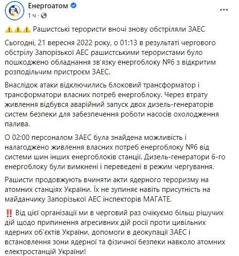 "21 сентября 2022 года, в 01:13 в результате очередного обстрела Запорожской АЭС рашистскими террористами было повреждено оборудование связи энергоблока №6 с открытым распределительным устройством ЗАЭС", - говорится в сообщении.