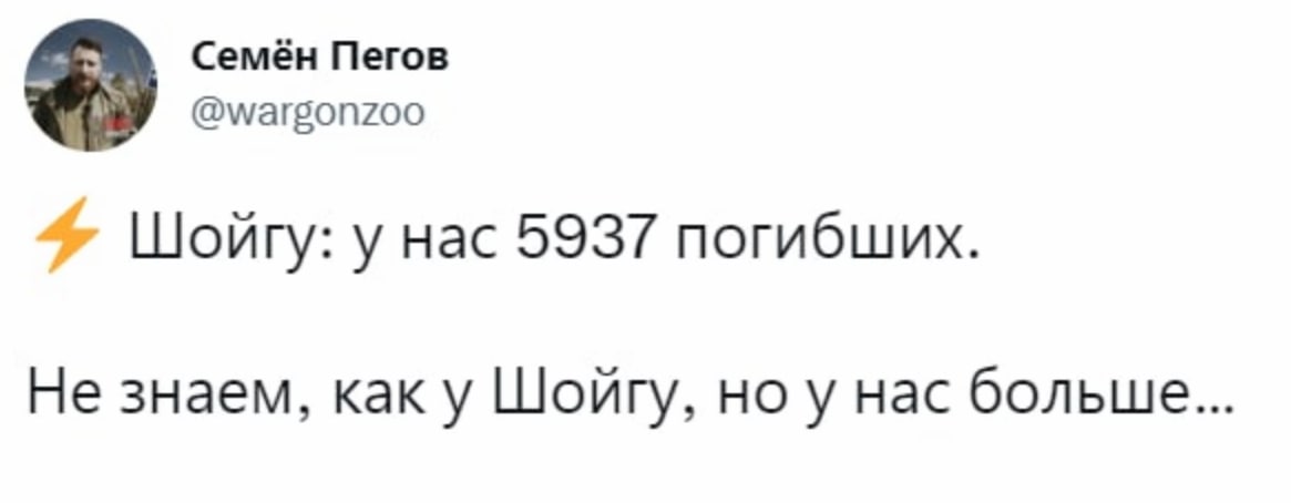 Российский военкор Семен Пегов отреагировал на заявление Шойгу о том, что РФ потеряла за 7 месяцев войны 6 тысяч человек.
