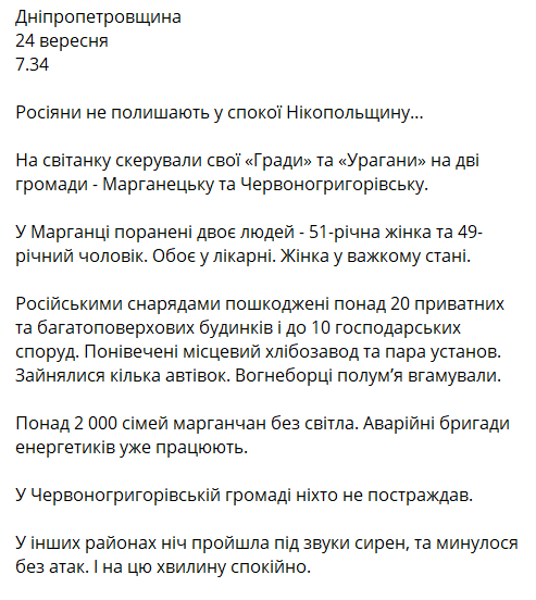 24 сентября на рассвете войска РФ обстреляли из "Градов" и "Ураганов" две громады в Никопольском районе Днепропетровской области – Марганецкую и Червоногригоровскую.