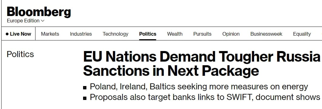 Ранее мы писали, что, по данным Bloomberg, ряд стран ЕС в рамках новых санкций против РФ предложили запретить передачу России долларовых банкнот и отключить еще больше российских банков от SWIFT, в том числе "Газпромбанк".