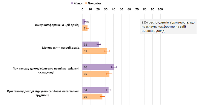 Об определенных материальных трудностях указывают 40% мужчин и 35% женщин, серьезные трудности - 34% мужчин и 26% женщин. Среди опрошенных 95% респондентов отмечают, что не живут комфортно на свой нынешний доход.