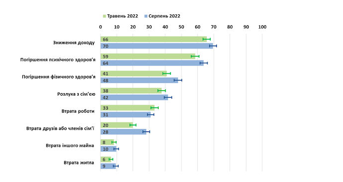 Кроме экономических проблем украинцы страдают также из-за других проблем, спровоцированных войной: ухудшение психического здоровья, ухудшение физического здоровья, потерю друзей или родственников.