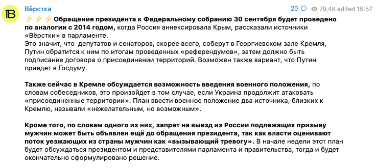 То есть депутатов и сенаторов соберут в Георгиевском зале Кремля, Путин обратится к ним по итогам проведенных "референдумов" на оккупированных территориях, затем должно быть подписание "договора" о "присоединении" этих территорий. Возможен также вариант, что Путин приедет в Госдуму.