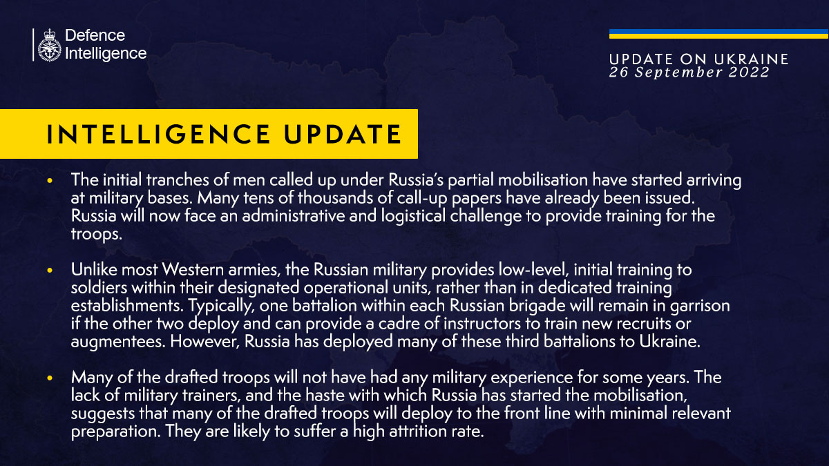 08.50 Разведка Британии пишет, что нехватка инструкторов и спешка, с которой Россия начала мобилизацию, позволяет предполагать, что многих из новобранцев бросят на линию фронта с минимальной подготовкой, и они, скорее всего, понесут большие потери.