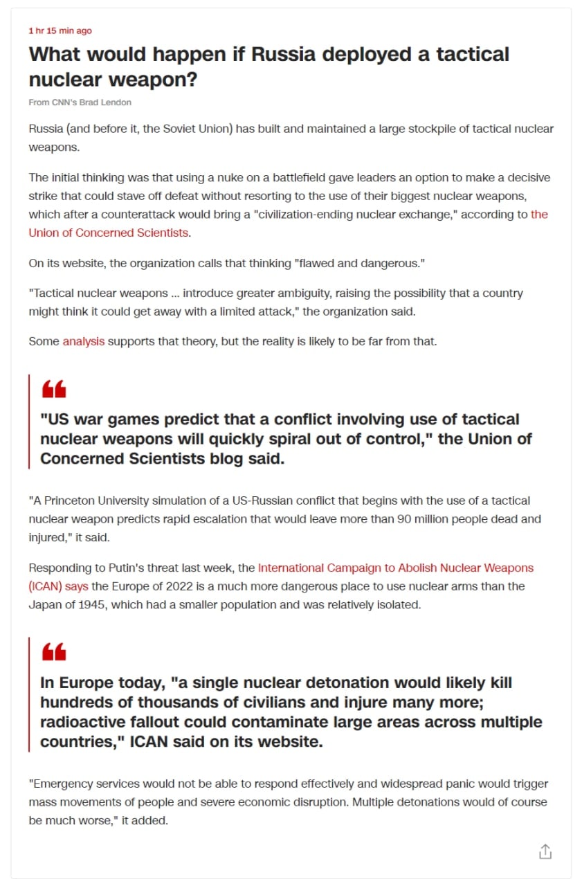 11.35 Применение Россией тактического ядерного оружия может иметь серьезные последствия. Американские военные учения указывают на то, что конфликт с применением такого вооружения быстро выйдет из-под контроля, сообщает CNN.
