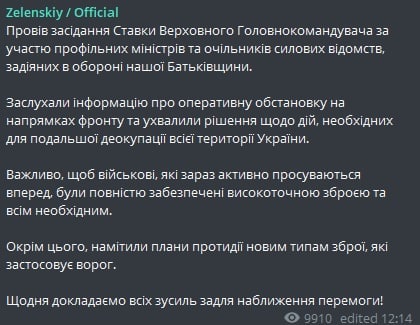 12.35 Владимир Зеленский провел заседание ставки Верховного главнокомандующего.