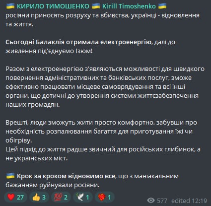 12.40 В освобожденной Балаклее Харьковской области сегодня дали электричество, далее будет подключен Изюм.