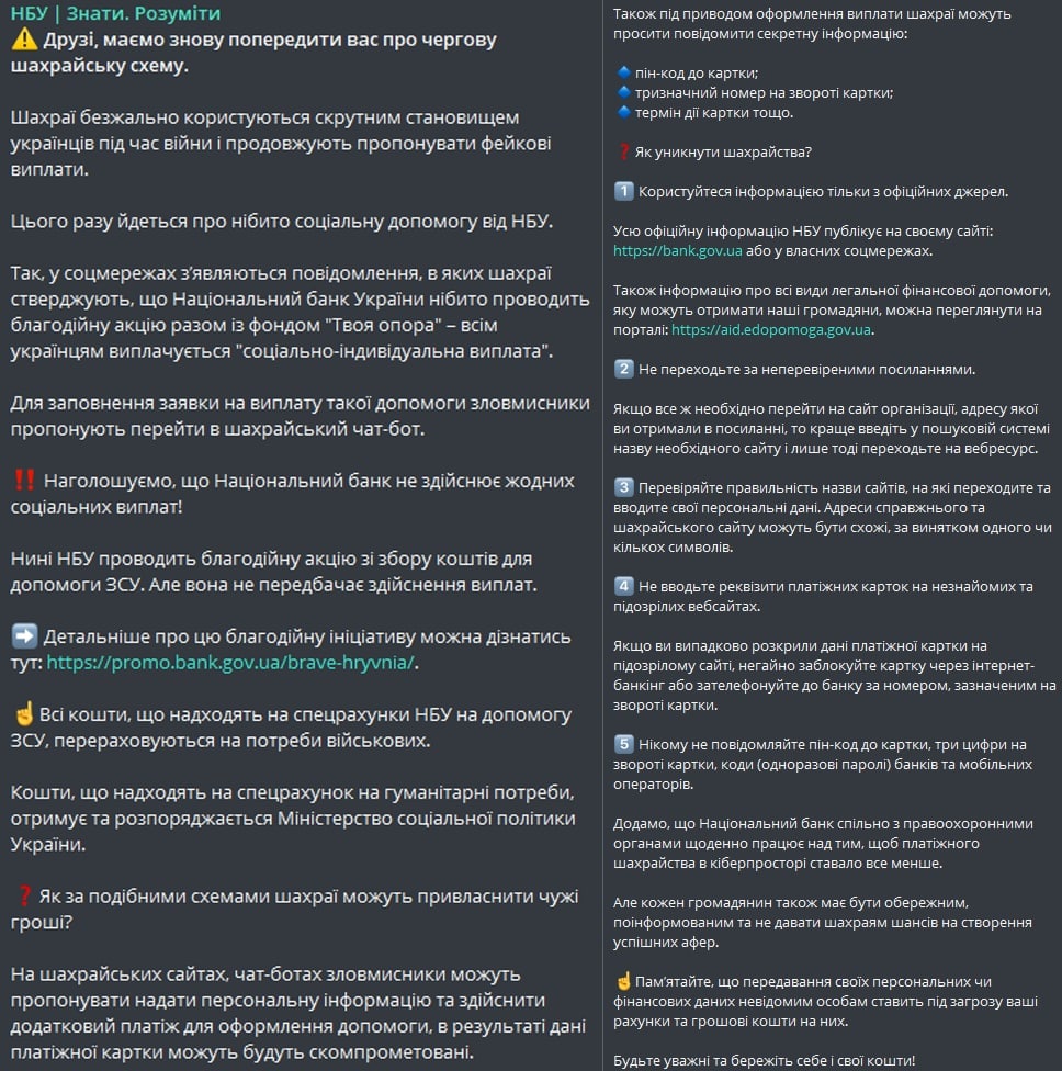 В сети появляются сообщения, в которых мошенники сообщают, что Нацбанк проводит благотворительную акцию вместе с фондом "Твоя опора", в рамках которой всем украинцам "выплачивается социально-индивидуальная выплата".