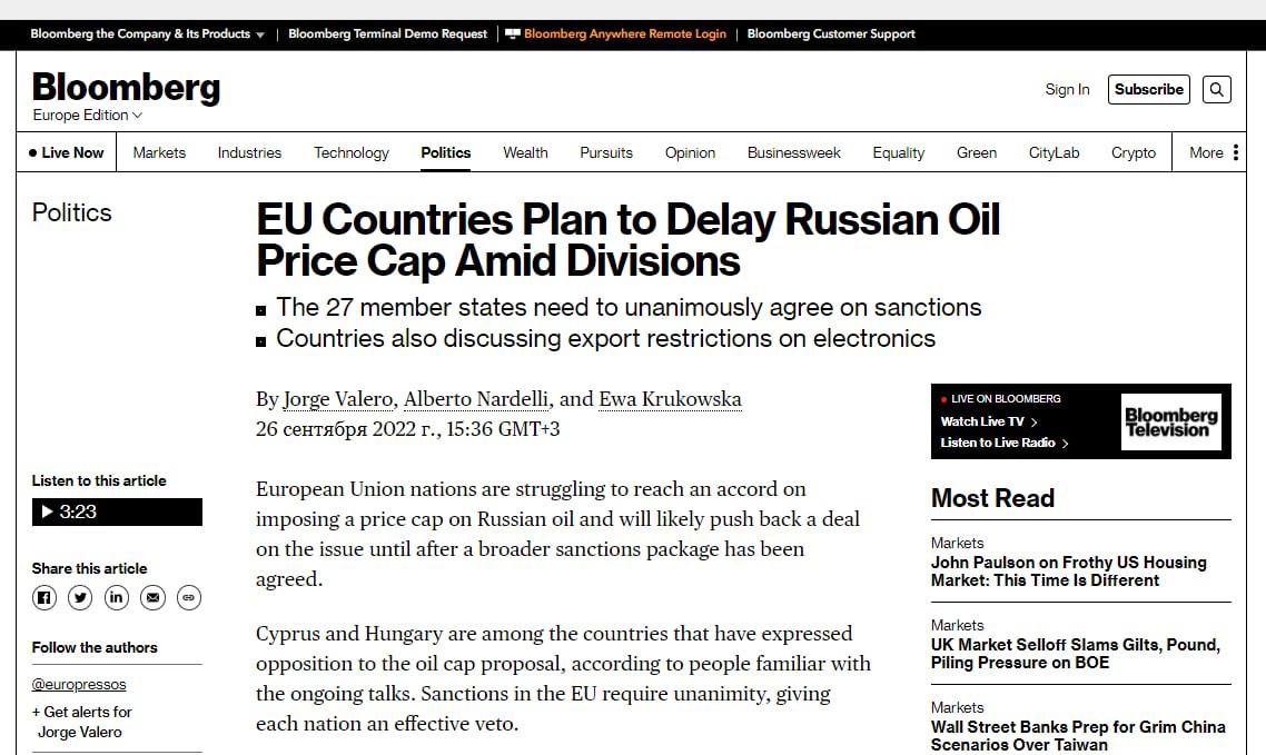 Тем временем сообщается, что, вслед за "Северным потоком-2" зафиксировано падение давления на обеих нитках "Северного потока-1". Причины пока неизвестны.