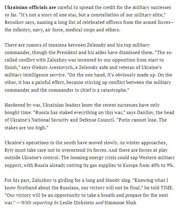 "Это оказалось одной из самых сильных черт [Зеленского]", - говорит Алексей Мельник, бывший помощник министра обороны Украины. Он позволил своим генералам управлять балом «без прямого вмешательства в военные дела", - написано в статье.