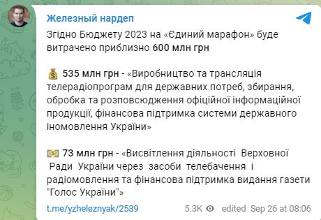 10.29 Финансирование национального единого телемарафона обойдется в 600 млн грн в 2023 году.