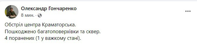 В Краматорске обстреляли центр города: одна ракета упала в парк скульптур "Рожденные в Украине" авторства известного художника из Донбасса Вячеслава Гутыри, вторая попала в пятиэтажку.