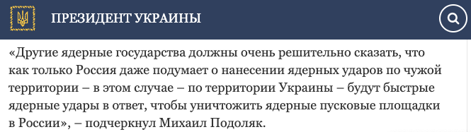 Советник главы ОПУ Михаил Подоляк призвал ядерные державы предупредить президента РФ Владимира Путина о возможности ядерного удара по территории РФ. Причём, как выходит из слов Подоляка, превентивного.