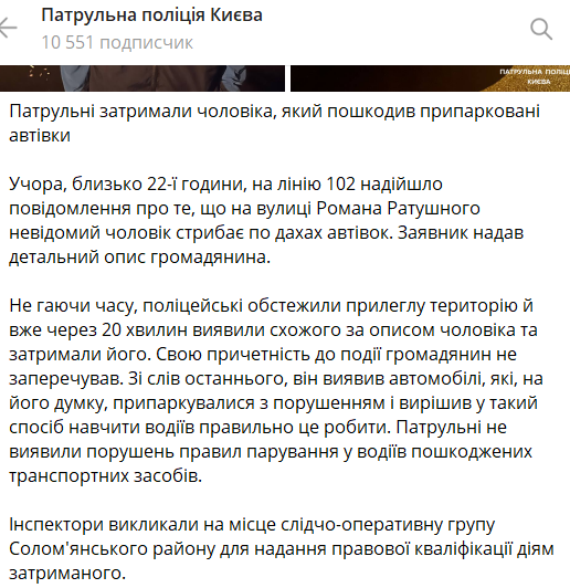 "В столичную полицию поступило сообщение о том, что на улице Романа Ратушного неизвестный мужчина прыгает по крышам автомобилей. Заявитель представил его детальное описание. Патрульные обследовали прилегающую территорию и уже через 20 минут обнаружили похожего по описанию мужчину и задержали его. Свою причастность к произошедшему гражданин не отрицал. По его словам , он обнаружил автомобили, которые, по его мнению, припарковались с нарушением и решил таким образом научить водителей правильно это делать", - говорится в сообщении.