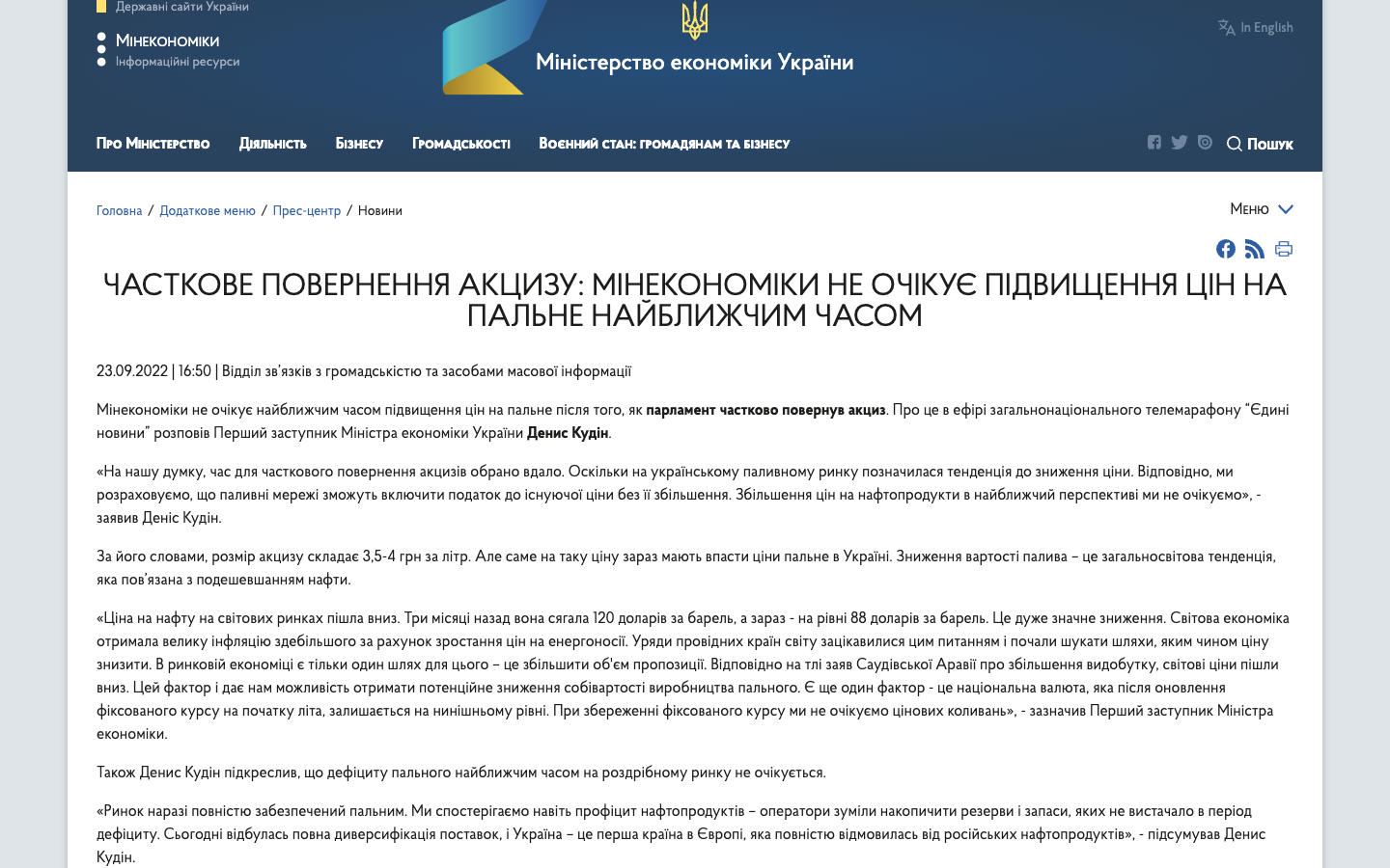Минэкономики не ожидает повышения цен на топливо в ближайшее время после возвращения акциза. По их расчетам, бензин должен был подешеветь на 3,5-4 грн за литр из-за мирового снижения цен на нефть, и как раз на эту сумму в Украине будет введен акциз.