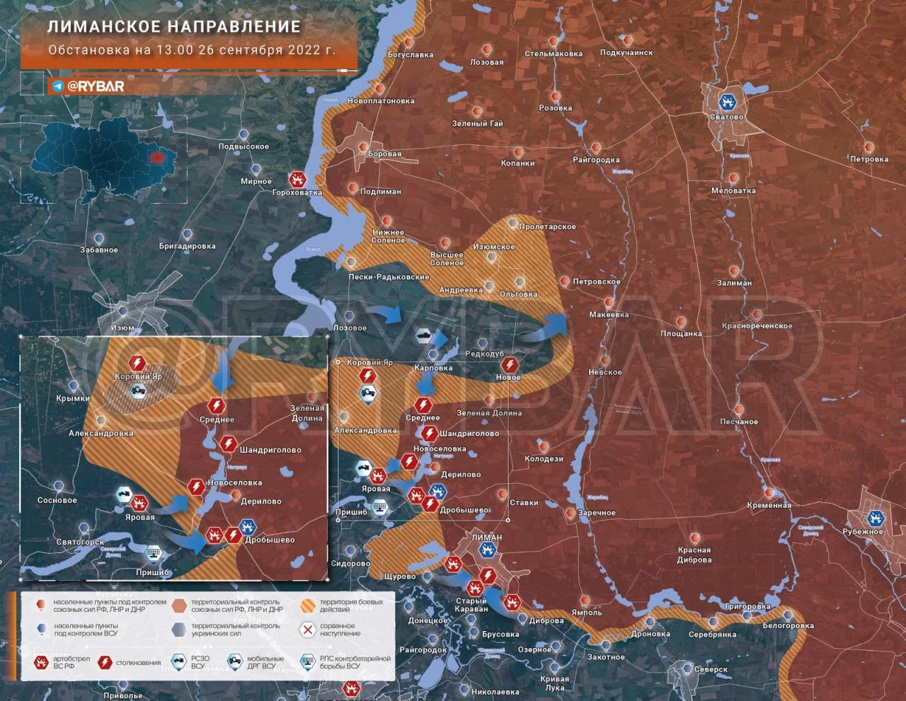 Российские телеграм-каналы сообщают об ожесточенных боях вокруг Лимана, куда наступают украинские войска. У ВСУ преимущество в живой силе, но ландшафт местности не позволяет его реализовать в полной мере.