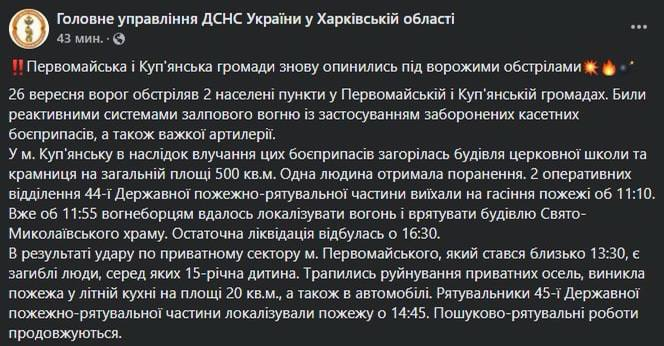 В Купянске в результате российского обстрела 26 сентября загорелись церковная школа и магазин. Кроме того, ранен один мирный житель.