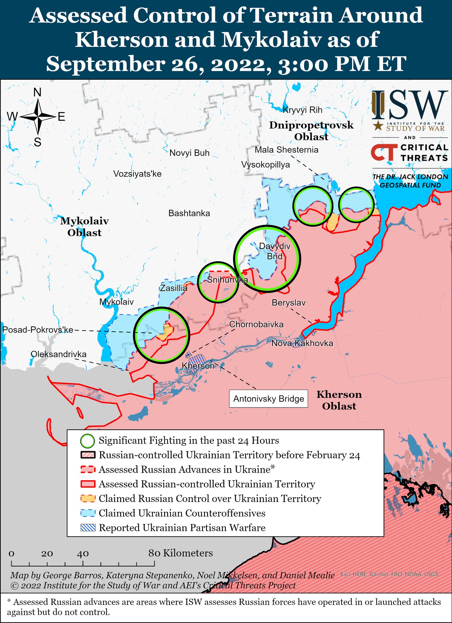Во вторник, 27 сентября, американский Институт изучения войны опубликовал новые карты боевых действий в Украине. Сообщается, что 25 и 26 сентября в рамках украинского контрнаступления в Харьковской и северной части Донецкой области продолжилось наступление ВСУ в районе Лимана.