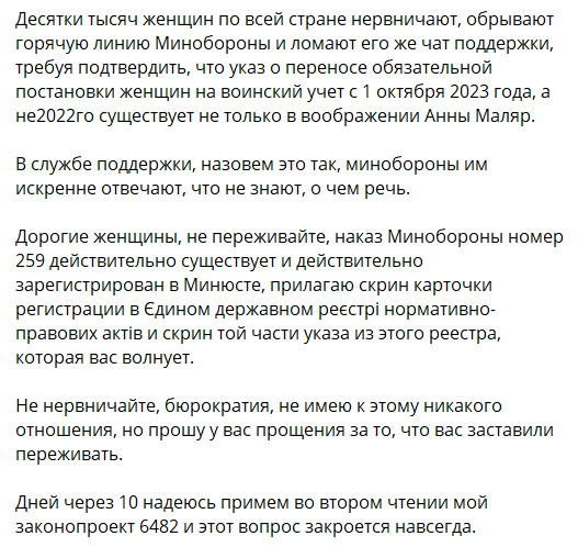 На горячих линиях Минобороны женщинам отвечают, что ничего не знают о приказе, которым обязательная постановка женщин на воинский учет переносится с 1 октября 2022 на 1 октября 2023 года.