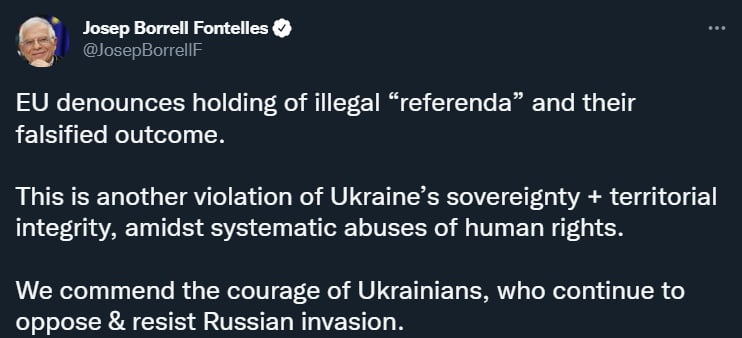 ЕС осуждает проведение незаконных "референдумов" и их сфальсифицированные результаты, заявил глава европейской дипломатии Жозеп Боррель.