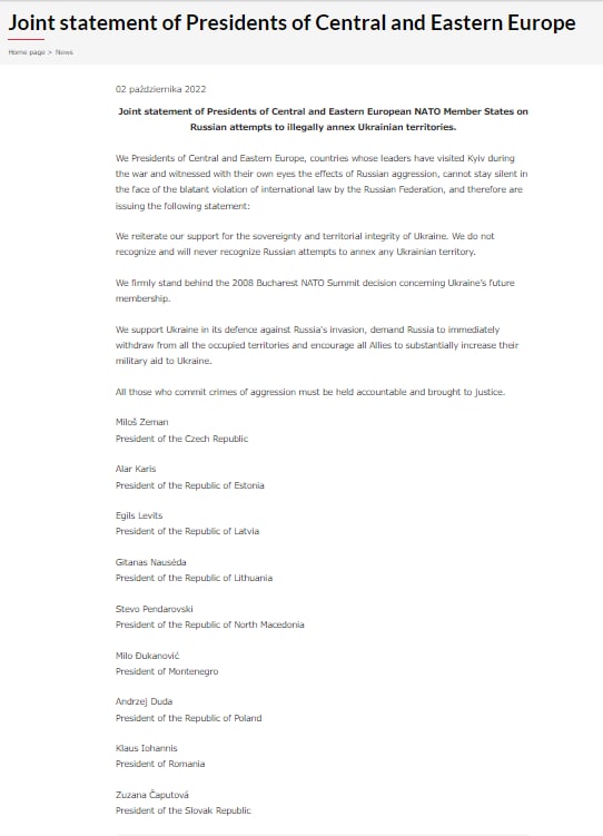 Президенты девяти стран НАТО из Центральной и Восточной Европы выразили поддержку решению Бухарестского саммита НАТО 2008 года относительно будущего членства Украины в Альянсе.