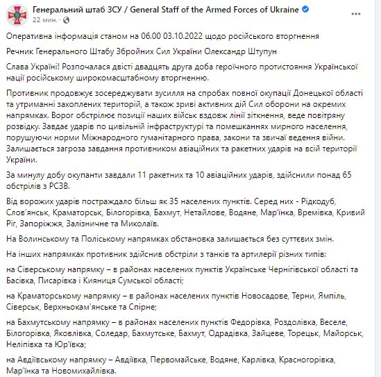 В понедельник, 3 октября, в Украине идет уже 222-й день с начала полномасштабного вторжения РФ.