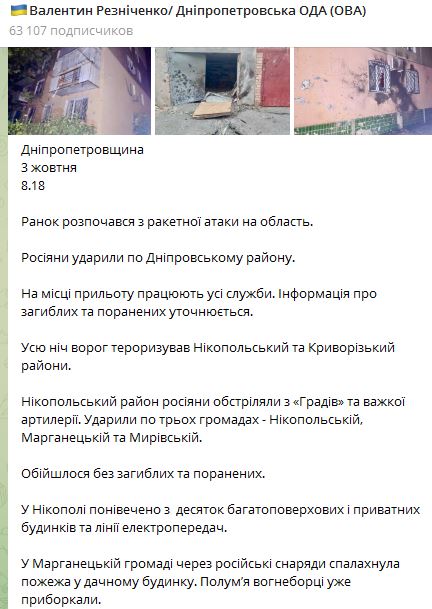 Всю ночь враг терроризировал Никопольский и Криворожский районы. Никопольский район россияне обстреляли из "Градов" и тяжелой артиллерии. Ударили по трем общинам – Никопольской, Марганецкой и Мировской.