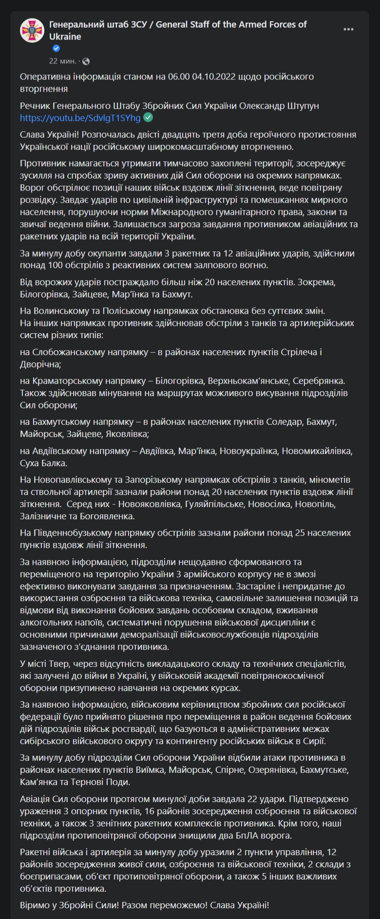 07:09 Сводка Генштаба ВСУ на утро 4 октября.