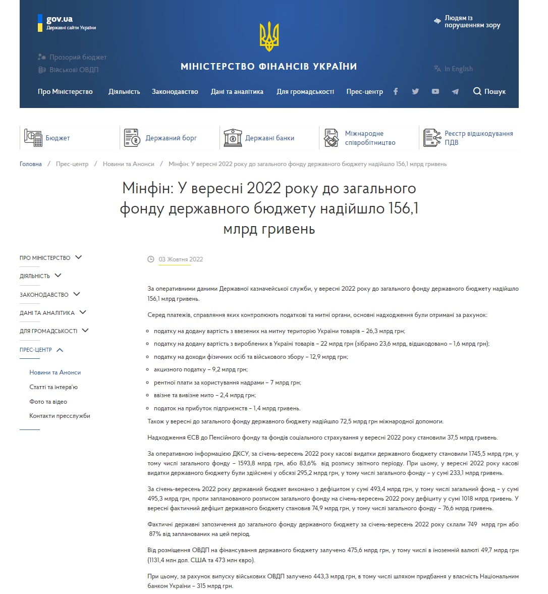 В сентябре 2022 года в общий фонд госбюджета поступило 156,1 млрд гривен, при этом расходы госбюджета составили 295,2 млрд грн, в том числе общего фонда — в сумме 233,1 млрд гривен.