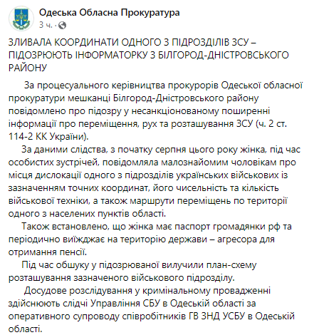 По данным следствия, жительница Белгород-Днестровского района с начала августа во время личных встреч сообщала малознакомым мужчинам о местах дислокации одного из подразделений украинских военных. При этом она передавала данные с указанием точных координат, численности подразделения и количества военной техники, а также маршруты перемещения по территории одного из населенных пунктов области.