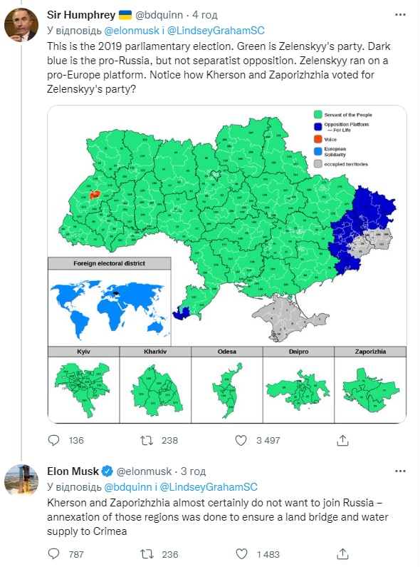 "Херсон и Запорожье почти наверняка не хотят присоединяться к России - аннексия этих областей была сделана для обеспечения сухопутного моста и водоснабжения Крыма", - заявил на это Маск.