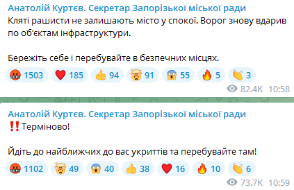 Около 11 утра Россия повторно обстреляла инфраструктурные объекты Запорожья. Об этом сообщил секретарь Запорожского горсовета Анатолий Куртев в телеграм-канале.