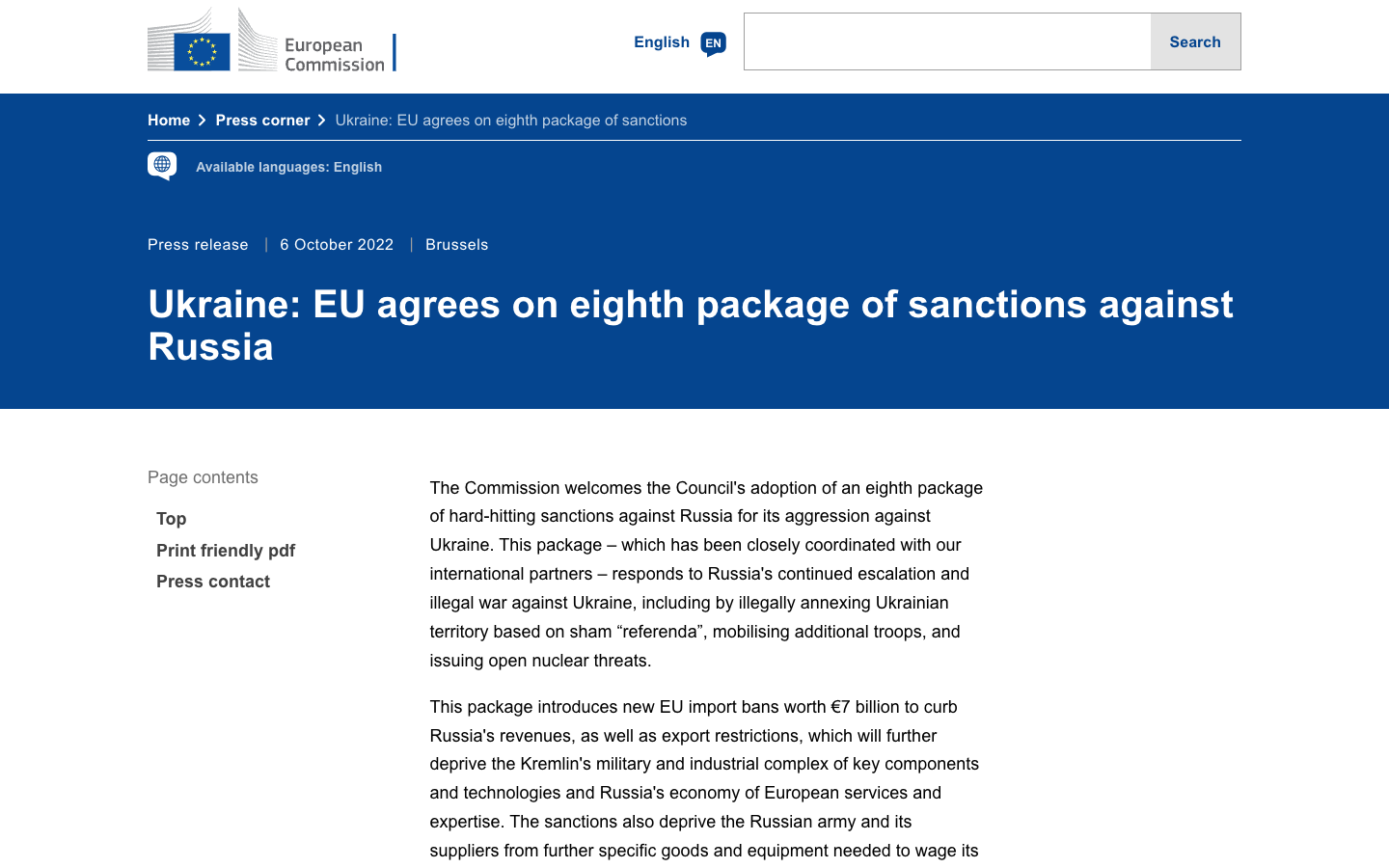 Как сообщает Еврокомиссия, санкции были введены, в том числе как ответ на российские "референдумы", мобилизацию и ядерные угрозы.