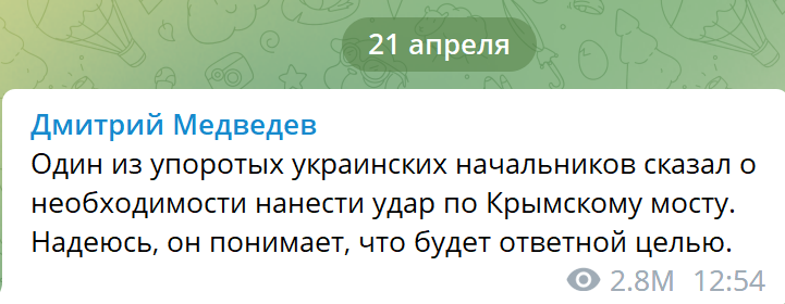 Многие российские военные блогеры уже напоминают обещание замглавы Совбеза РФ Дмитрия Медведева устроить "судный день" за нападение на Крым и его высказанное в телеграме 21 апреля обещание нанести "ответный удар" в случае атаки на Крымский мост.