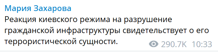 "Реакция киевского режима на разрушение гражданской инфраструктуры свидетельствует о его террористической сущности", - заявила спикер ведомства Мария Захарова.
