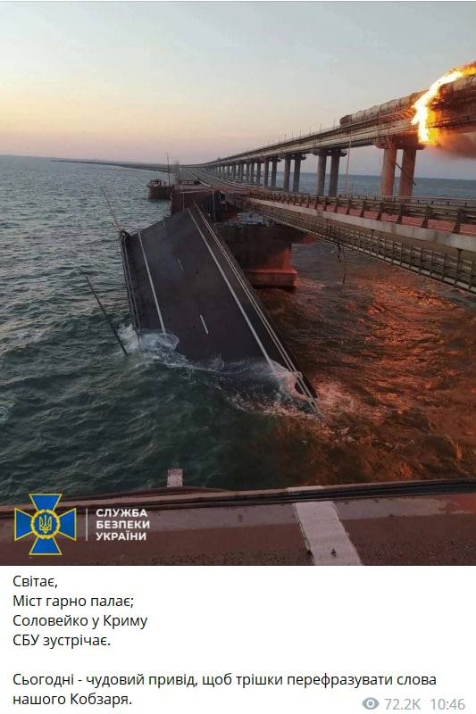 СБУ в честь подрыва Крымского моста позволило себе немного творчества. В официальном телеграм-канале Службы появилось перефразированное стихотворение Тараса Шевченко: