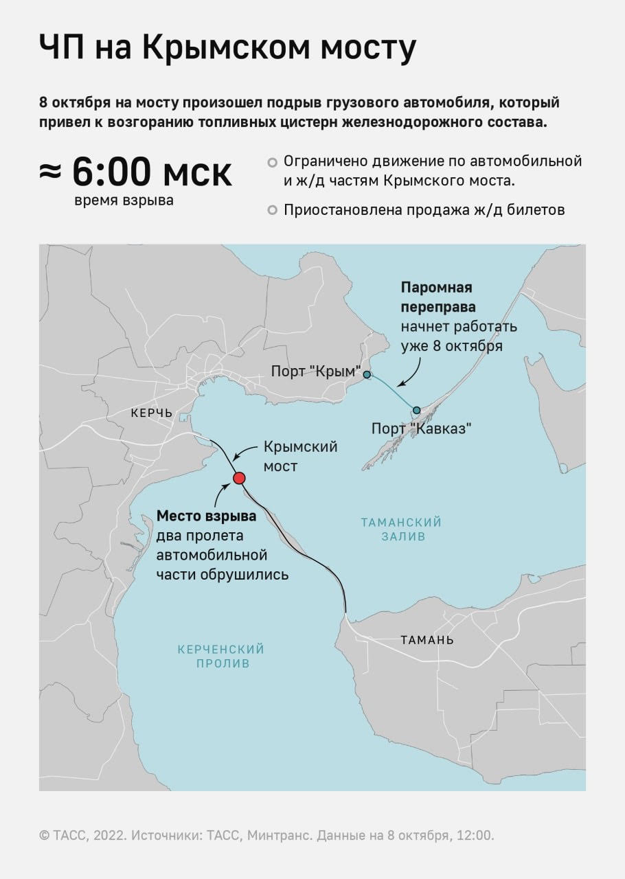 Итак, сегодня утром был взорван Крымский мост. Там рухнули в море две автомобильные нитки, которые вели с материковой территории России в Керчь.
