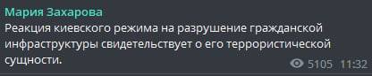 "Реакция киевского режима на разрушение гражданской инфраструктуры свидетельствует о его террористической сущности", - сообщила представитель МИД РФ Мария Захарова.