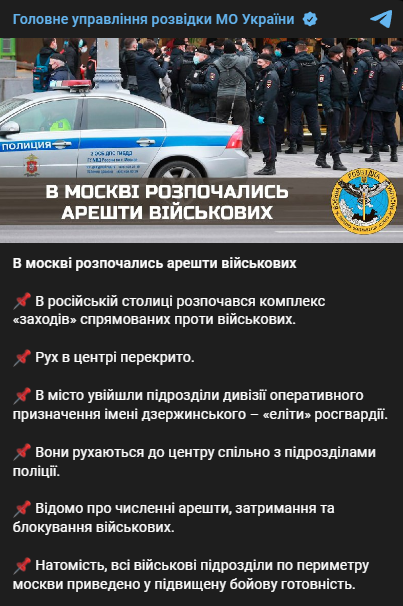 Также пресс-служба ГУР написала о многочисленных арестах, задержаниях и блокировках военных. Вместе с этим, все военные подразделения по периметру Москвы были приведены в повышенную боевую готовность.