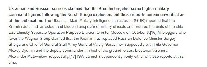 "Украинские и российские источники утверждали, что после взрыва на Керченском мосту Кремль нацелился на некоторых высших военных чинов, но на момент публикации эти сообщения остаются непроверенными... В настоящее время ISW не может независимо проверить ни один из этих отчетов", - говорится в сообщении.