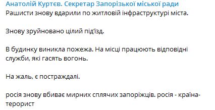 Секретарь Запорожского горсовета Анатолий Куртев сообщил, что ракетный удар вновь уничтожил целый подъезд в жилом доме: "Рашисты снова ударили по жилищной инфраструктуре города. Снова разрушен целый подъезд. В доме возник пожар. На месте работают соответствующие службы".