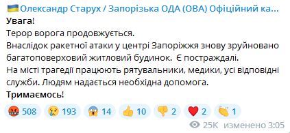 Позже стало известно, что в результате ракетной атаки в центре Запорожья вновь разрушен многоэтажный жилой дом. Есть пострадавшие.