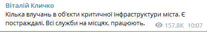 Мэр Киева Виталий Кличко сообщил, что утром 10 октября несколько попаданий пришлось по "объектам критической инфраструктуры". Об этом он написал у себя в телеграм-канале.