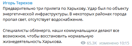"Специалисты облэнерго, наши коммунальщики делают все возможное, чтобы восстановить нормальную жизнедеятельность Харькова", - написал Терехов.