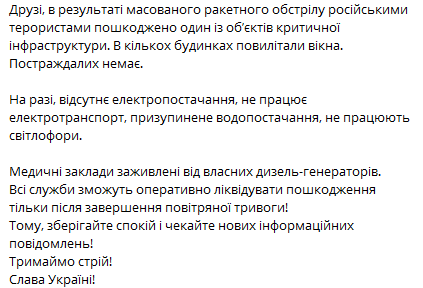 Медицинские учреждения заживлены от собственных дизель-генераторов. Все службы смогут оперативно устранить повреждение только после завершения воздушной тревоги!", - написал Симчишин.