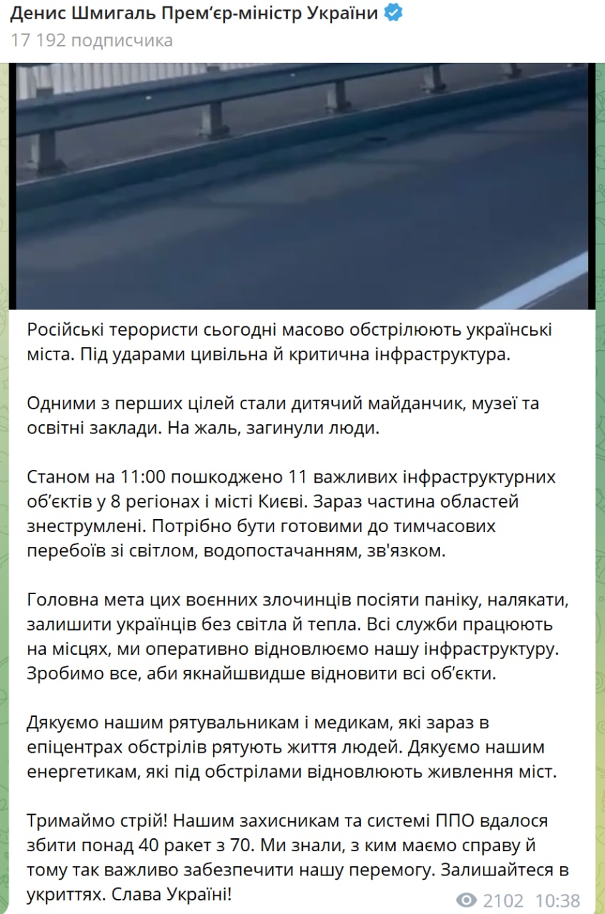 Премьер-министр Украины Денис Шмыгаль пишет о характере повреждений после массированной атаки РФ по всей Украине 10 октября.