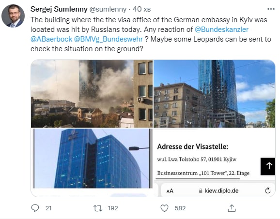 Бывший председатель Фонда Бёлля в Киеве Сергей Сумленный опубликовал фотографии в Твиттере и написал канцлеру Олафу Шольцу и министру иностранных дел Анналене Бербок: "Может быть, вы хотите отправить пару танков "Леопард", чтобы проверить ситуацию на месте?"