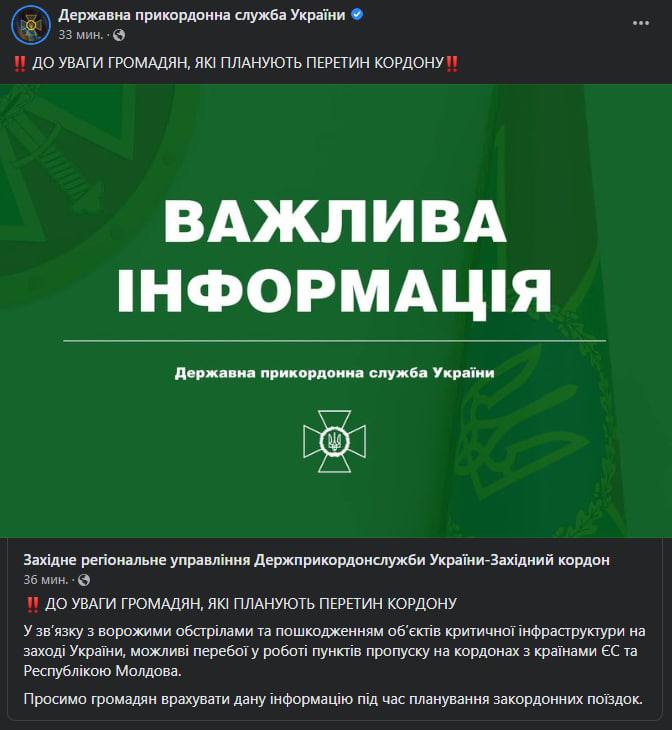 Также информацию о закрытии погранпунктов подтверждают в Госпогранслужбе Украины. Там объясняют такое решение повреждением объектов критической инфраструктуры.