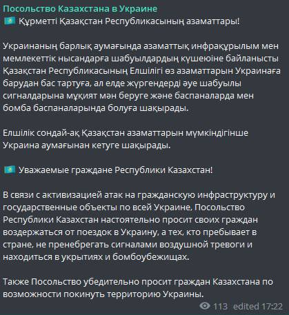 "В связи с активизацией атак на гражданскую инфраструктуру и государственные объекты по всей Украине, посольство Республики Казахстан настоятельно просит своих граждан воздержаться от поездок в Украину, а тех, кто пребывает в стране, не пренебрегать сигналами воздушной тревоги и находиться в укрытиях и бомбоубежищах. Также посольство убедительно просит граждан Казахстана по возможности покинуть территорию Украины", - сообщает пресс-служба посольства в Telegram.