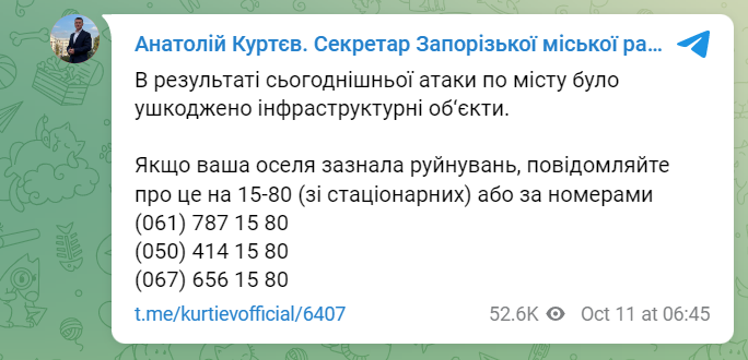 "В результате сегодняшней атаки по городу были повреждены инфраструктурные объекты. Если ваш дом получил разрушения, сообщайте об этом на 15-80 (со стационарных) или по номерам: (061) 787 15 80, (050) 414 15 80, (067) 656 15 80", - написал в телеграм-канале секретарь Запорожского горсовета Анатолий Куртев.